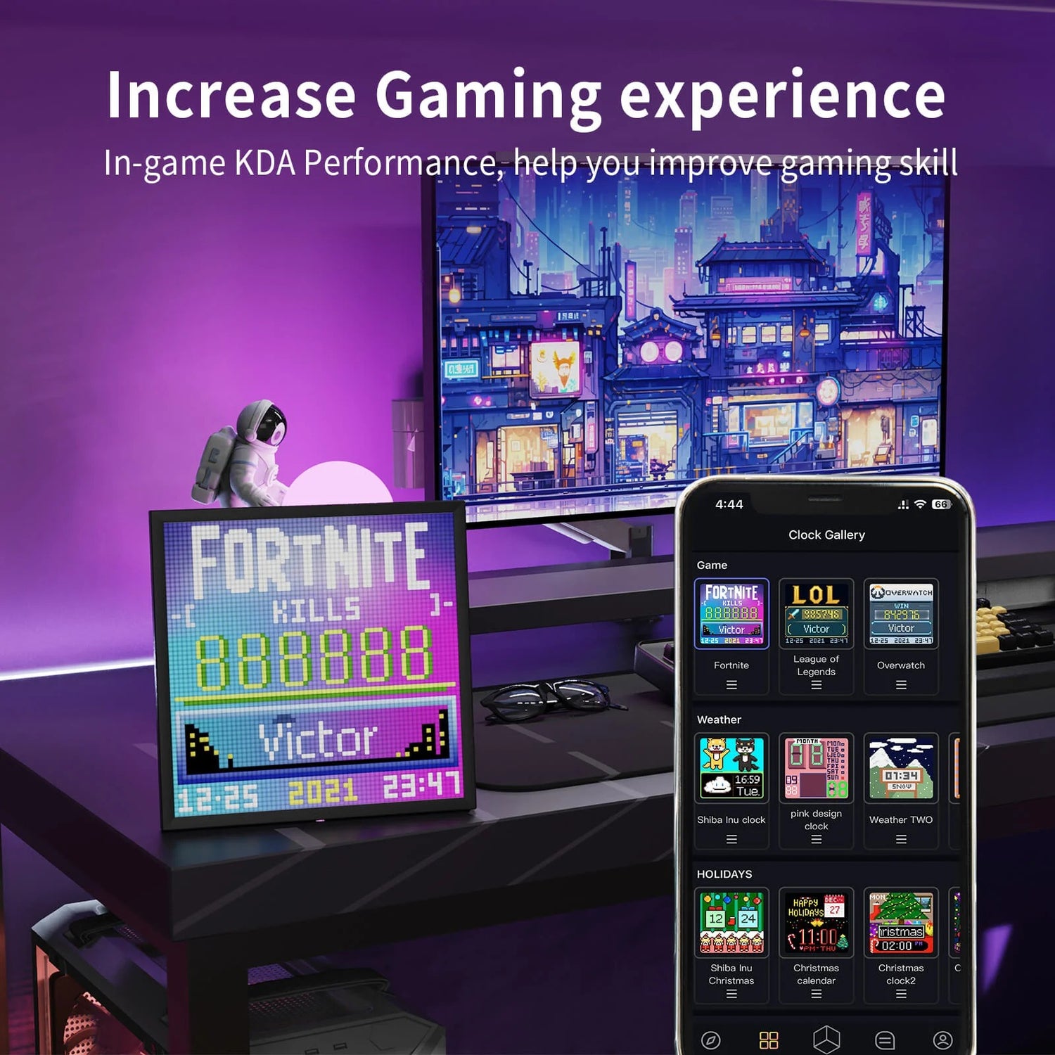 【Meet Pixoo-64】 10.3" Wi-Fi pixel art frame with a 64×64 LED matrix. Use it as a pixel clock or a live info board for followers, Twitch stats, game KDA, and more.【Create with Divoom App】 Draw, animate, add scrolling text, and import GIFs. Explore a huge community gallery to download, share, and collaborate.